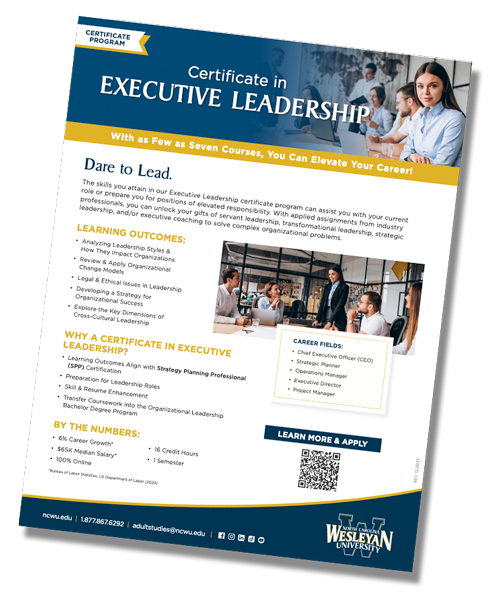 NCWU’s Executive Leadership Certificate is designed for professionals who want to grow as leaders and take on greater responsibility in the workplace. It is a good fit for current supervisors, team leads, department coordinators, and professionals preparing for management roles. It can also benefit individuals who have leadership responsibilities without a formal leadership title.