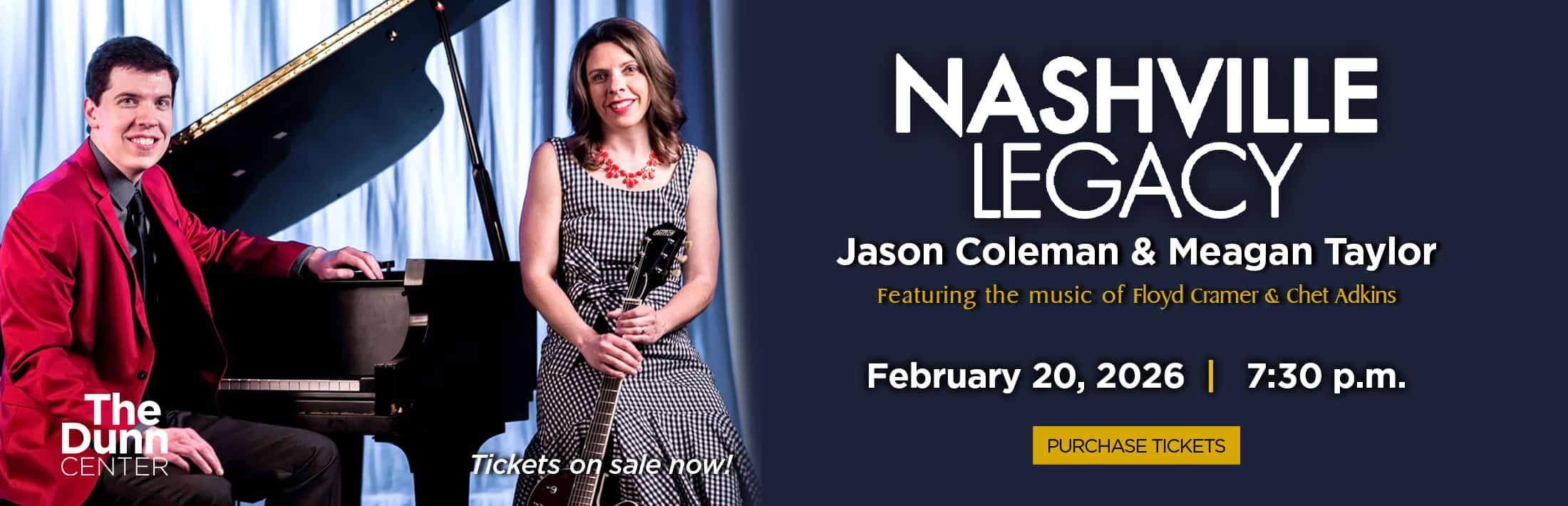 Pianist Jason Coleman, grandson of Floyd Cramer, and guitarist Meagan Taylor, great-niece of Chet Atkins, transport audiences to Nashville’s golden era with the timeless music of their legendary relatives and the artists they influenced.
